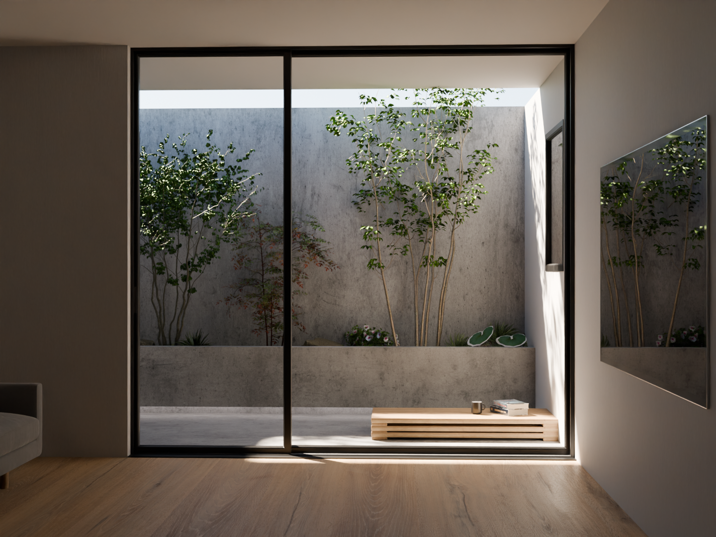 玄関からはその景色を別角度から切り取るピクチャーウィンドウを提案。