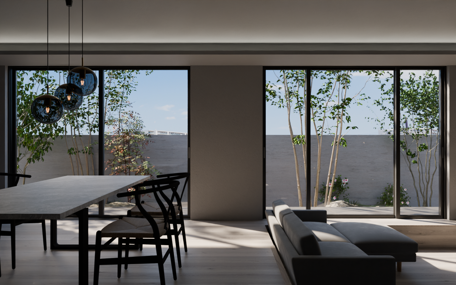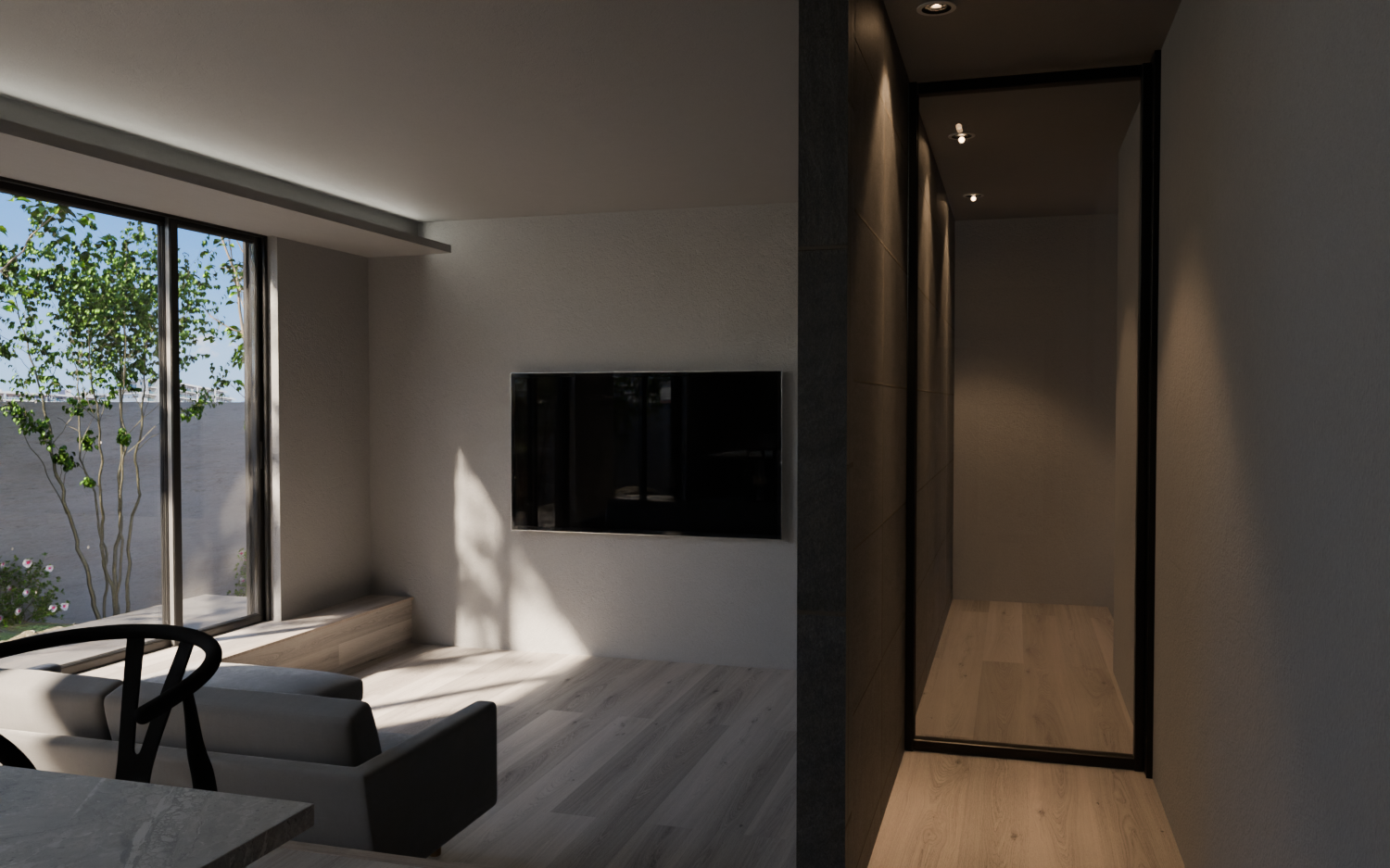 シンプルで落ち着いた色合いでまとめ、間接照明でLDK全体を柔らかく包み、洗練されたホテルのような住まいに。